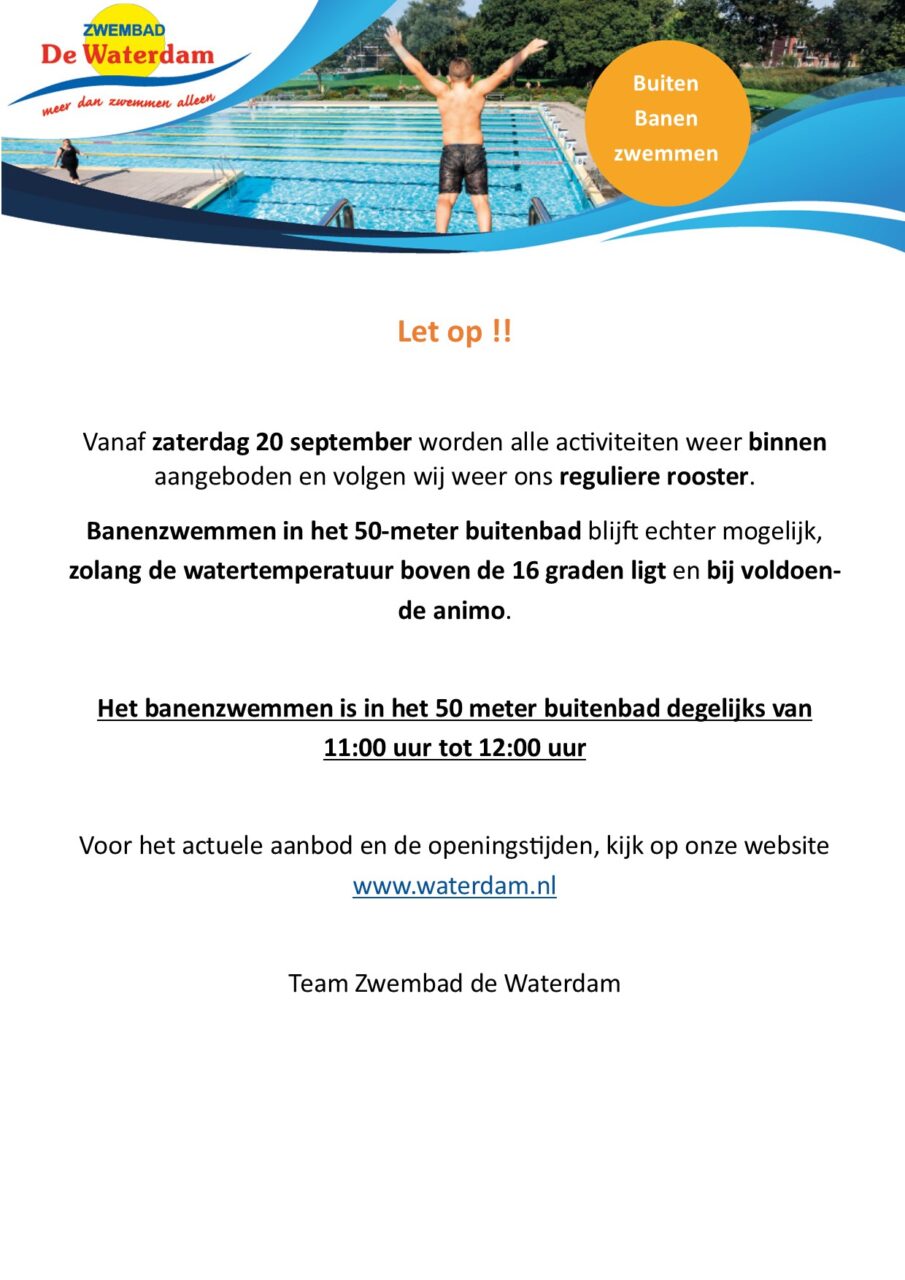 Vandaag voor het eerst bij jullie gezwommen. En dat is ons goed bevallen, komen zeker nog eens terug (vanuit Zaandam) Om weer een keertje binnen te zwemmen maar ook bij warme dagen van de buiten baden te genieten.