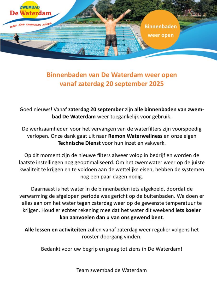 15 jaar geleden begonnen met zwangerschapszwemmen, later het lijf weer in vorm met aquarobics gekregen, en al snel met mijn baby gaan zwemmen het water is er warm genoeg voor en gister met mijn inmiddels 14 jarige zoon weer heerlijk gezwommen, wij wonen allang niet meer in de buurt maar voor dit zwembad blijven wij komen...