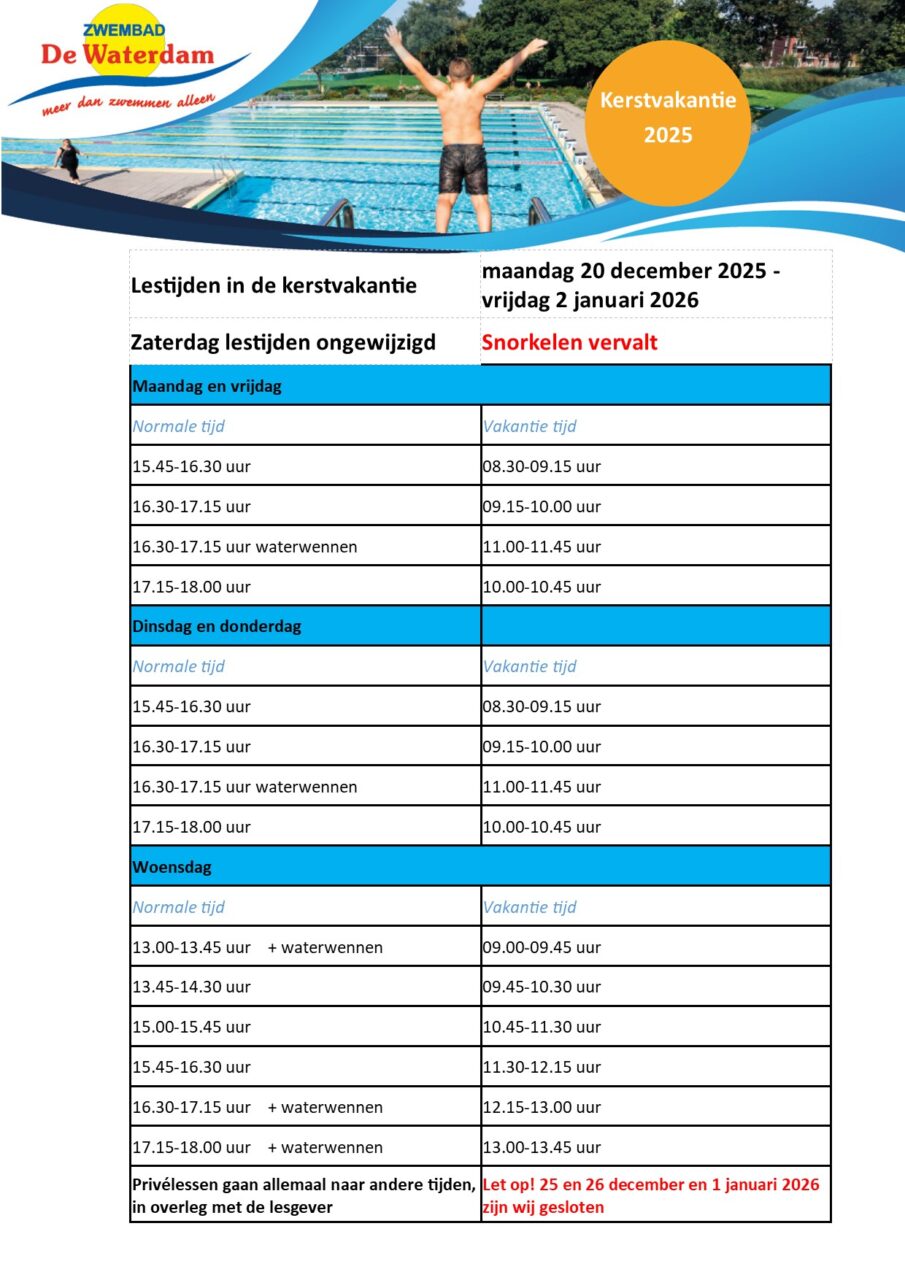 Zwemlessen in de Waterdam Lestijden kerstvakantie 20 december 2025 t/m 2 januari 2026
